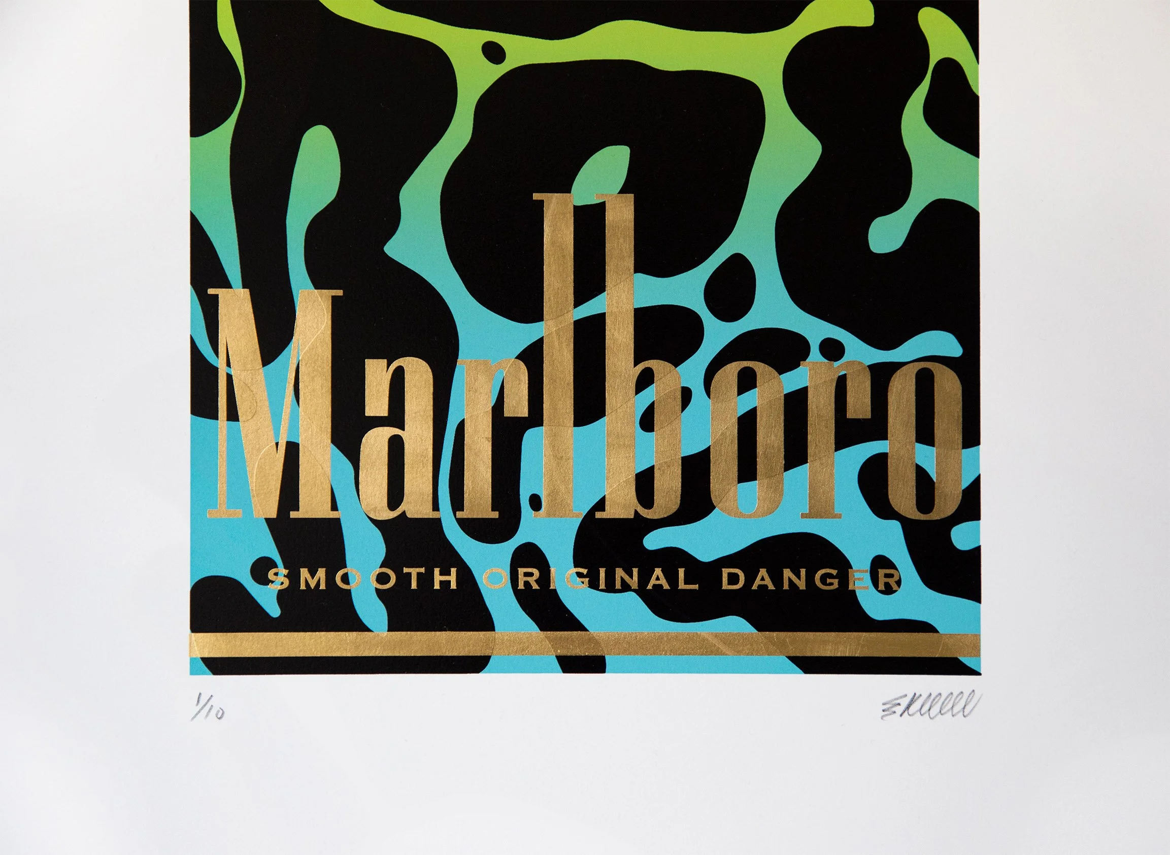 ‘Danger’ is a 3 layer hand pulled screen print series which uses aposematic design on classic cigarette packaging. Imagining a world in which bad for your health consumer products also expressed their toxicity with bold colours and striking patterns. The hand pulled gradient, oily black varnish and gold foil combine to create a disorienting yet satisfying finish. This print was made in an edition of 10 and is sold out.